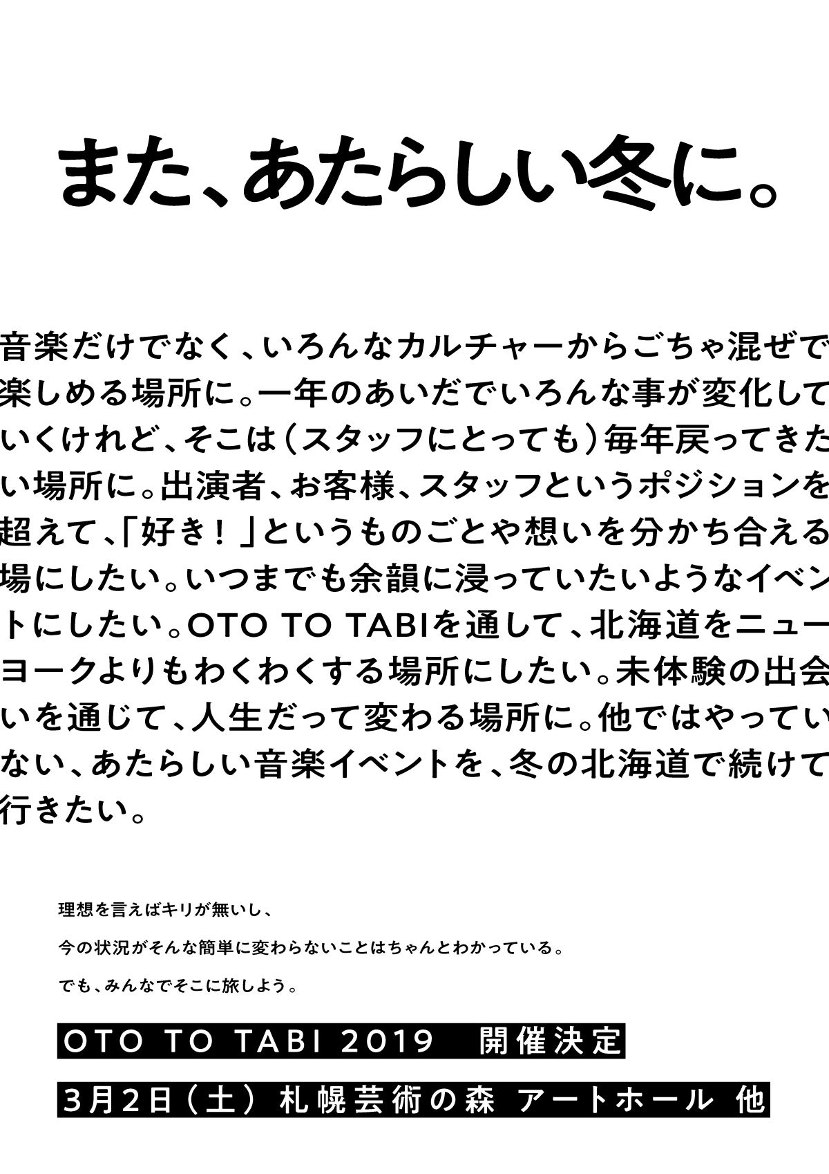 "北海道の冬に音楽フェスを"との想いから、ただの音楽好きが集まって、2011年にスタートした音楽イベントOTO TO TABIは9年目を迎えます。イベントとして成長できた面もありますが、まだまだ超えられずにいる壁があることも事実です。さまざまな課題を乗り越え、より良いイベントにしながらこの先続けていくのは、自分たちだけでは難しいと感じ、OTO TO TABIを応援してくださるみなさまに、支援のお願いをさせていただくことにしました。この先も一緒に特別な冬の一日を作っていきたく、ぜひご協力をよろしくお願いいたします。