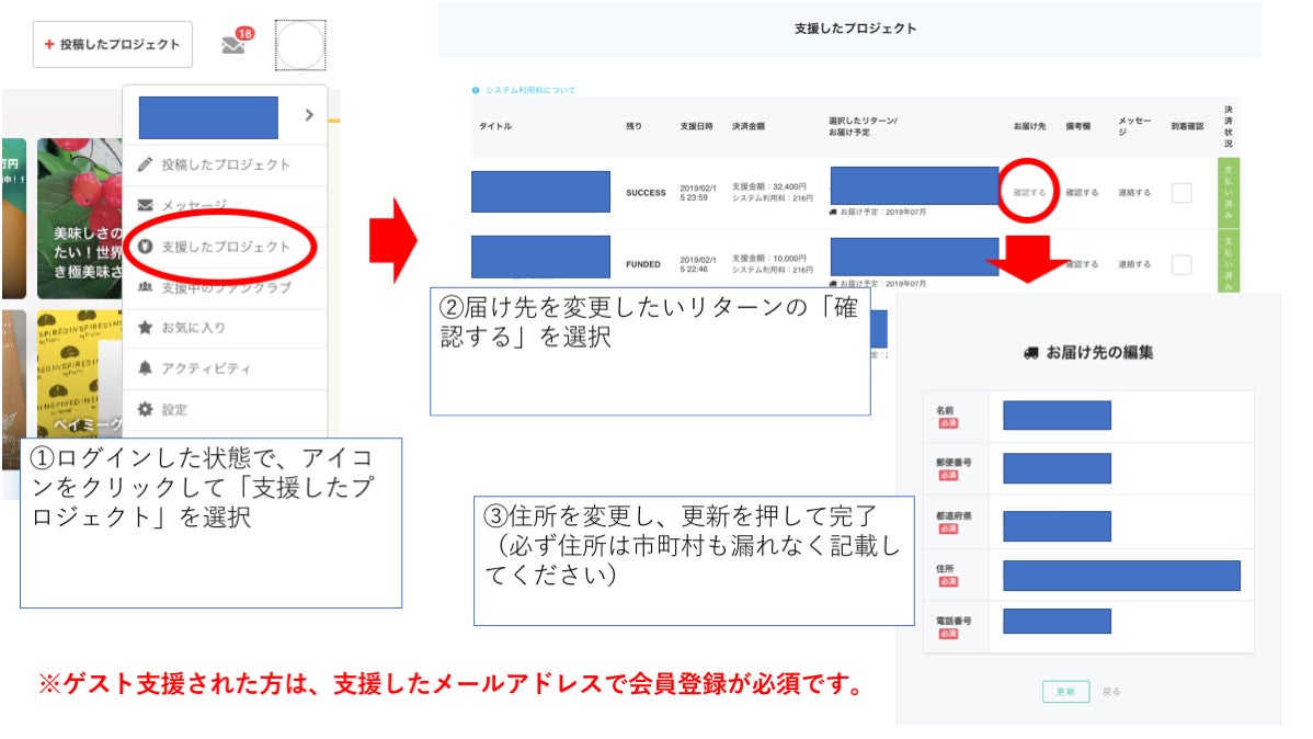 A:マイページ内の「支援したプロジェクト」にて「お届け先」→「確認する」より変更可能です。(プロフィールのお届け先情報の変更ではございません。ご注意くださいませ。)プロジェクト終了後の住所変更につきましては、変更後にメッセージでプロジェクトオーナーへその旨の連絡をお願いします。