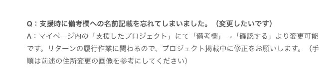 支援時に備考欄へ名前記載を忘れた方の対応ですがコメント送付での手動対応は確認漏れが起きる為行わない方針のようです。(※最終的に1000人を超える事があると想定している為手動管理は難しいだろうという判断となりました)