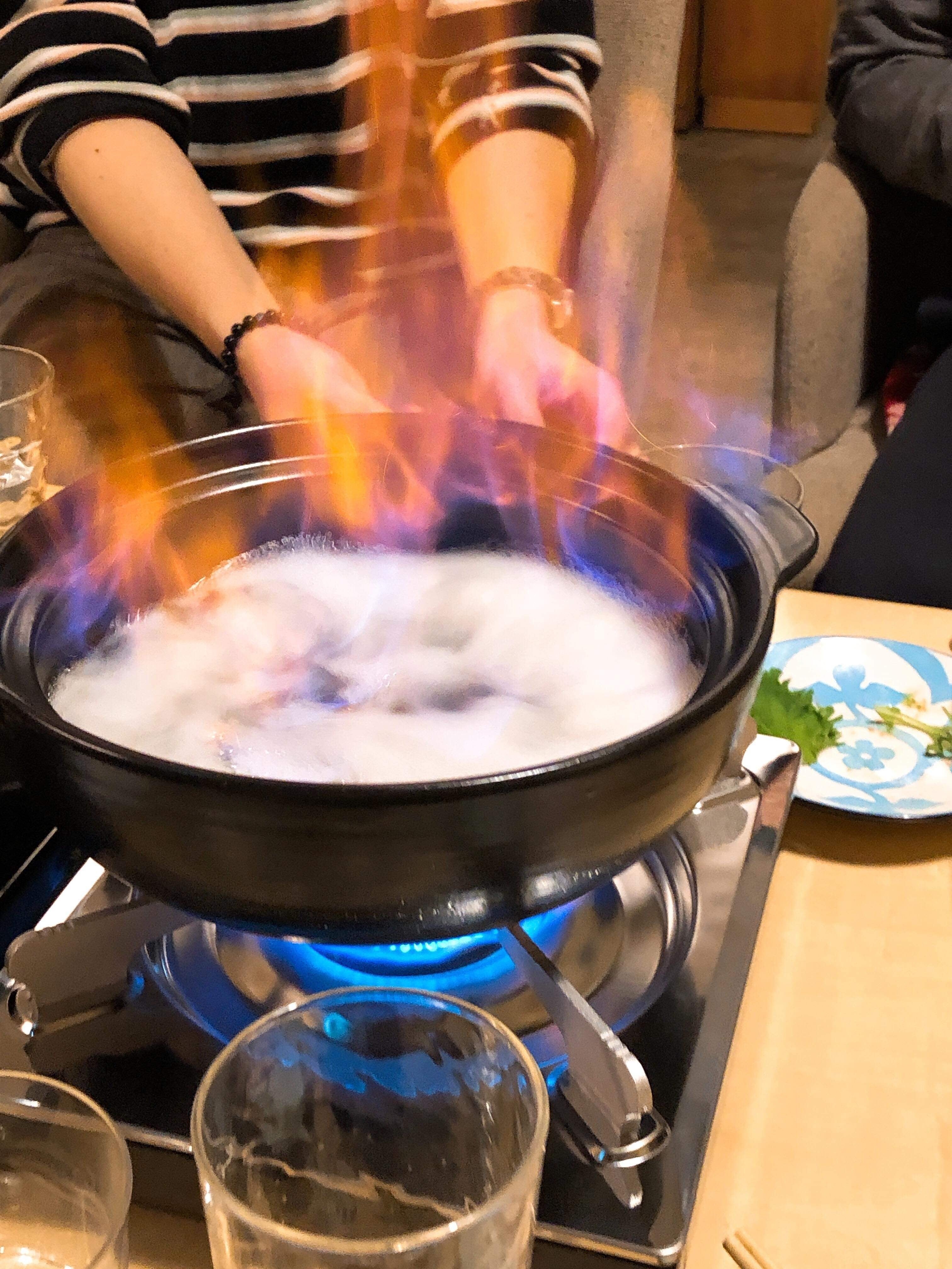最後はやっぱり日本酒しゃぶしゃぶ!煮立って来たら火をつけてアルコールを飛ばして、長野産の太郎ポークでしゃぶしゃぶ♪♪
