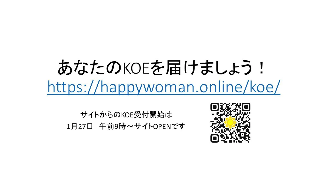 * 女性のKOEを届ける会議のため、原則KOEは女性限定となります。会場は、同伴者が女性の場合は、男性も参加可能です。男性のみの場合女装・心が女性の方は、2階席になりますが当日黄色い服装をしてくださることで入場できます。また参加チケットの払い戻しはございませんのでご了承下さい。