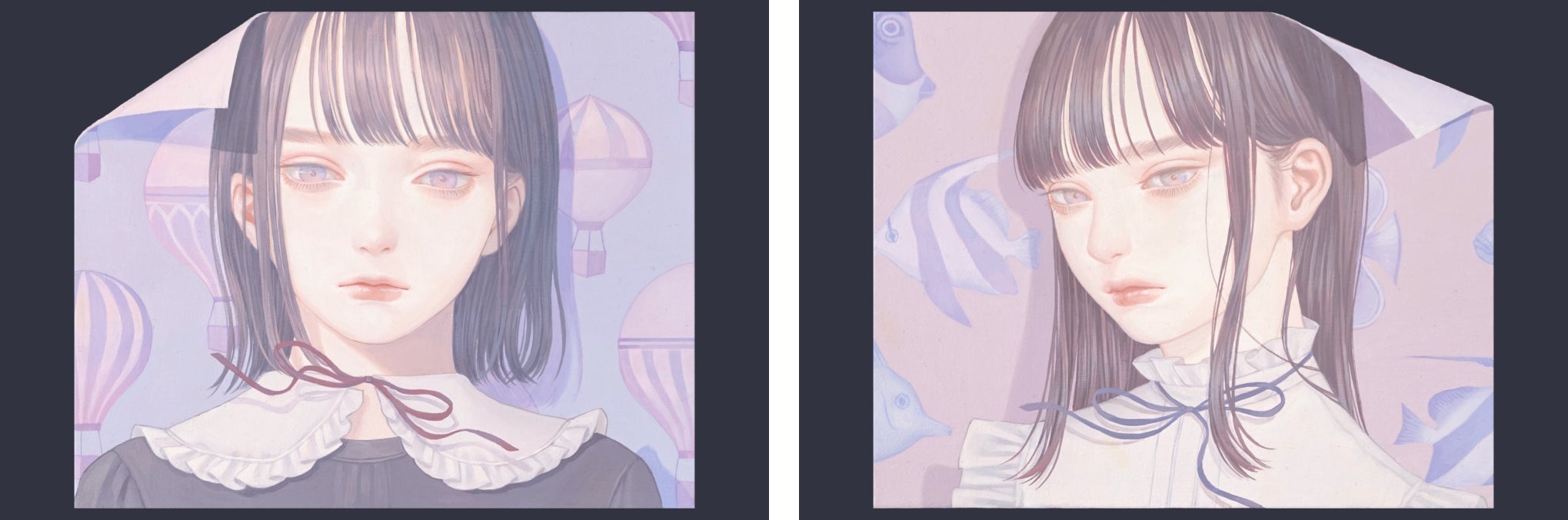 例えば、「好きだからいじわるしてしまう」というような相反する心の動きなどに惹かれます。過去の記憶や日常の中に落ちているそれらを拾い集めて、女の子やかわいいものをモチーフにあまさと毒っぽさが共存している絵を描いています。