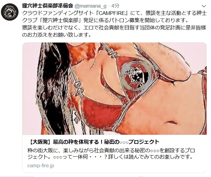 2019/04/11 00:04これから毎週金曜日、ファンディング終了まで紳士クラブの体験イベントをアメリカ村のバー「秘密工房4号基地」で行います。体験とは言っても、エロにまつわる催しや猥談をしようって程度のもので形式張った事は予定していませんので、お気軽にご参加頂ければと思います。入場料1500円、飲食物は全て持ち込みです。氷やグラス等はこちらで用意致します、好きなお酒を持ち込んでのんびり飲むもよし、他の参加者様とお酒や食べ物を交換しあって楽しむもよし。イベントホストは2人、発起人のわたくしJUN(右)と自称心斎橋で一番エロいバーの元マスターもじゃ君が勤めます。4月12日(金)の一回目はテーマに沿った猥談や体験談の発表会、語り手への質疑応答を予定しています。来週以降は界隈のエロ活動家の方々をゲストにお呼びし、よりイベントらしいイベントに出来ればなと考えていますので、どうぞお楽しみに!以後の予定やイベントの様子はこちらとTwitterにて報告します。twitterではイベント情報の他、日々の小さな活動の報告等もしていますので、宜しければチェックしてみて下さいませ!狸穴紳士倶楽部twitter もっと見る