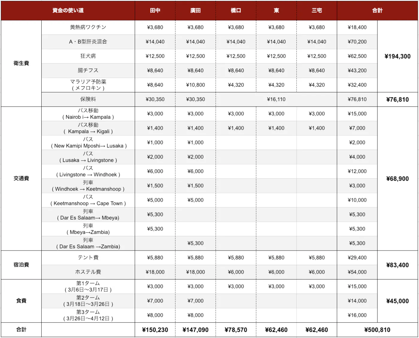資金については「 現地での生命維持費や必要経費 」に使わせていただきます。用途は表の中にある4項目「衛生費・現地交通費・宿泊費・食費」です。用途別, 人別で詳細に記入させていただきました。