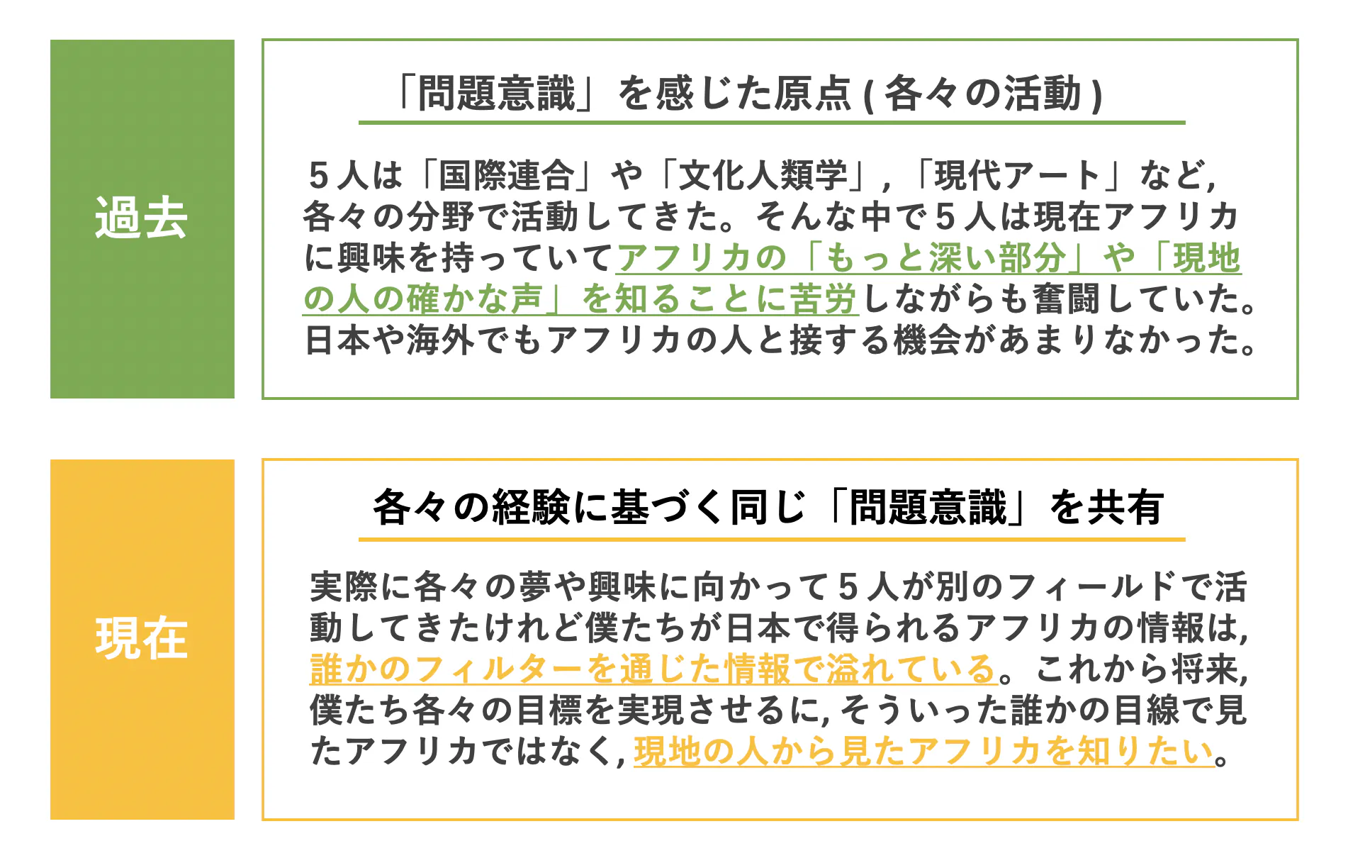 そこで, アフリカへ行き彼 / 彼女らと交流する中で, 現地の人の目線になって物事を考えたい。現地の人は, どうアフリカや, 世界を見ているかを知りたいと思うように, 機会や経験がないなら現地に行こうという結論に至りました。