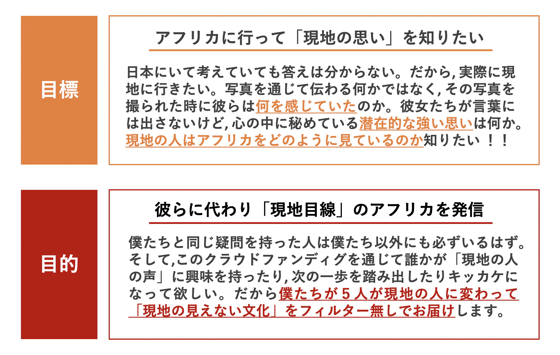 1人では出来なかった事でも, 僕たち5人でアフリカに行く事で, 僕たちの主観ではなく, 現地目線のアフリカを知ることが出来る。各々が別々のフィールドで活動してきたその経験を結集すれば「主観ではない現地目線のアフリカ」を知ることが出来ると思い, 5人で現地に行く事にしました!
