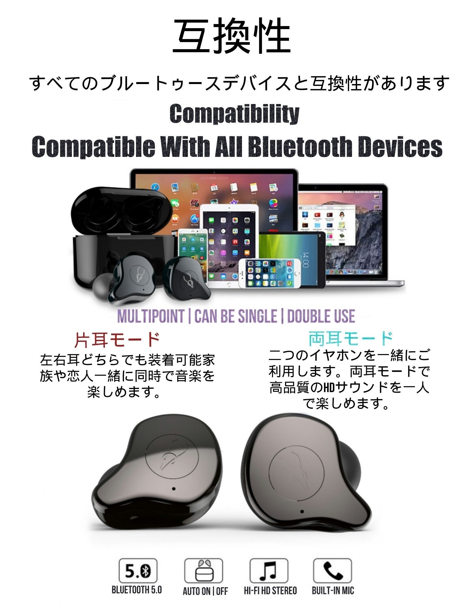 すべてのブルートゥースデバイスと互換性があります。片耳モードでも両耳モードでも使用出来ます。
