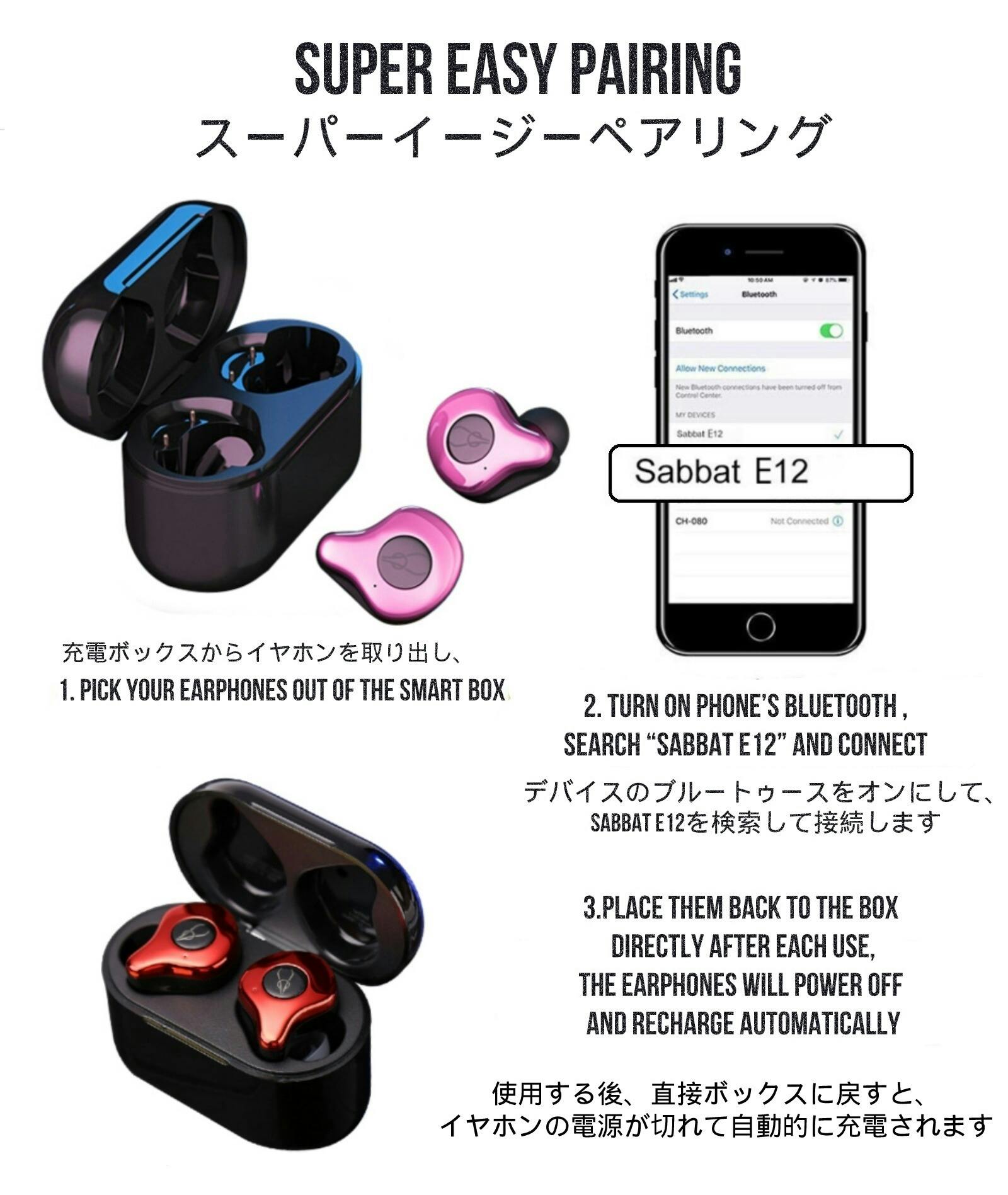 簡単にワンタイム初期設定で、ボックスから取り出すと自動的にペアリングされ、終了すると自動的に切断されます。SabbatE12を一度だけデバイスに接続すると、充電ボックスから取り出すたびに自動的にペアリングされます。SabbatE12は充電ボックスに戻すと自動的にデバイスから接続を解除し、自動的に電源されます。