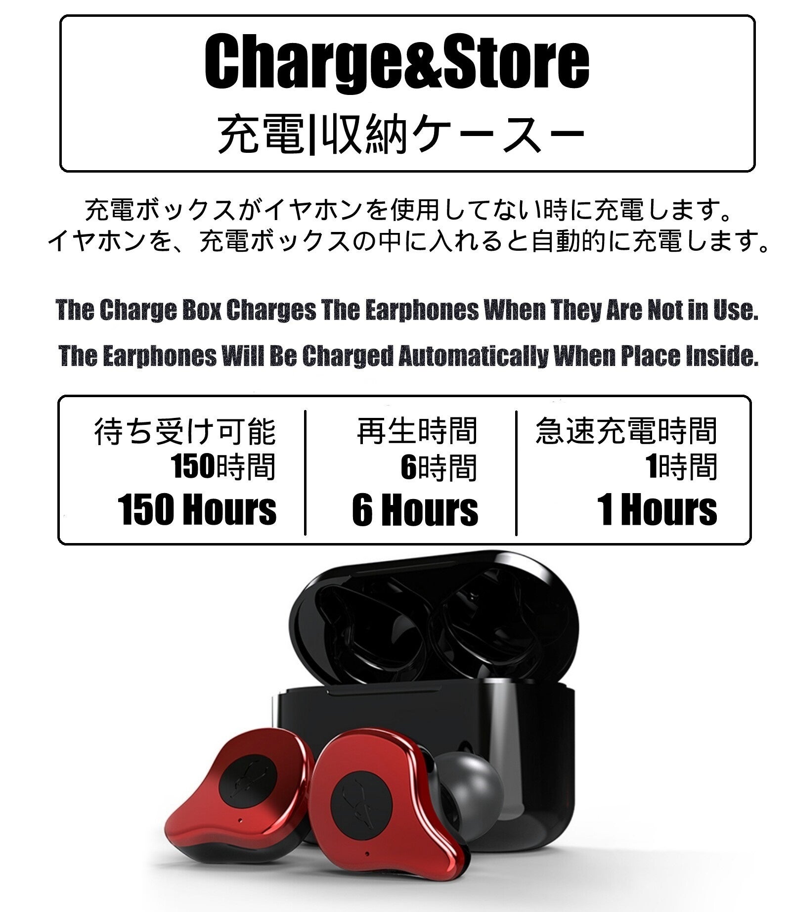 ※イヤホンを1回の充電で約6-8h音楽を楽しめ、急速充電機能付き、1時間で満タンになれます。 ※音量や、電波状況、使用環境などにより、多少異なる場合がございますので、ご了承ください。フル充電されると自動的に充電が止まるので過充電を防止します。