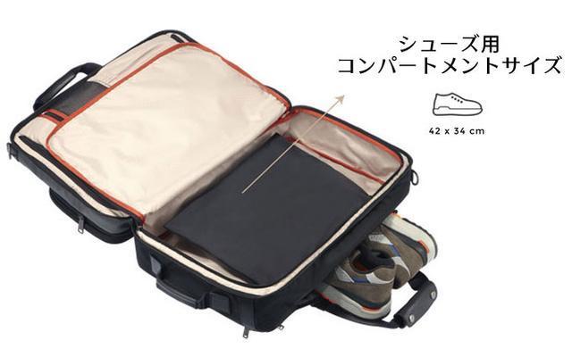 シューズ収納用のコンパートメントは撥水加工素材となっており、水気に対する対策もされています。シューズを持ち運ばない時は、濡れた衣類や汚れた衣類を収納することもできるので大変便利です。