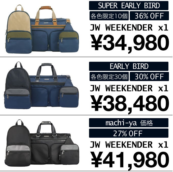 アメリカMonyker社の「JW Weekender」は、「3 in 1」と「3WAY」を両立させた高品質&多機能バッグです。米国のクラウドファンディングKickstarterとIndiegogoでは大人気となり、合計6,000万円の資金調達に成功した大人気のバッグとなります。