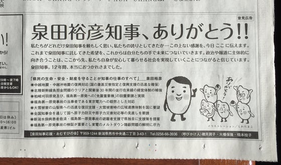 新潟日報の紙面を共同購入してくださいました皆さま。おかげさまで、10月24日(月)の新潟日報の朝刊に、泉田知事への感謝広告が掲載されました!!ありがとうございました!! リターン品発送の準備にとりかかります。お手元に届くまでの間、今暫くお待たせしますが、どうかお楽しみに☆