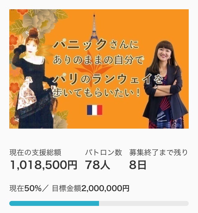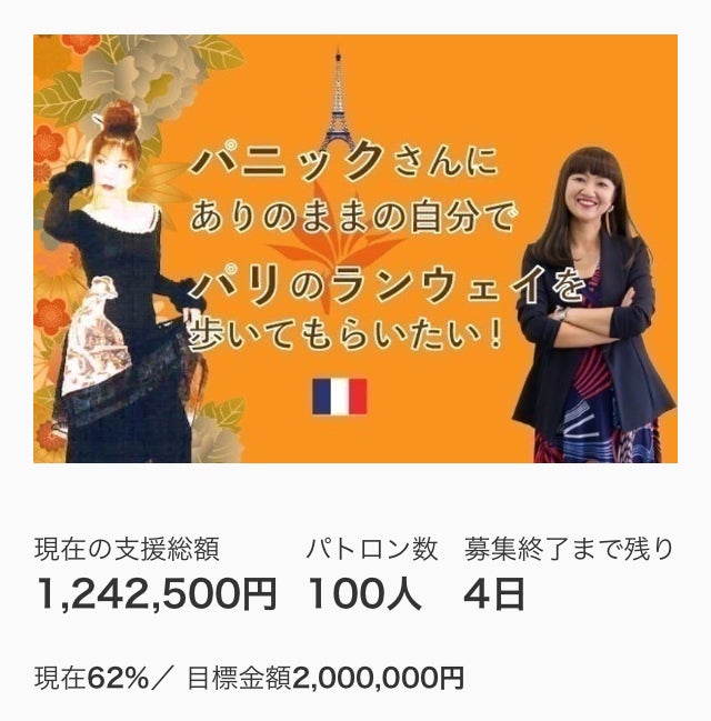 皆さんのご支援、応援、シェア、拡散のおかげで、パニックさんに ありのままの自分でパリのランウェイを歩いてもらいたい!クラウドファンディングを100%達成することができました!!!これは、私一人では成し得ぬ結果です。最後の最後までお付き合いくださり、また、私を走り抜けさせてくださり、本当にありがとうございました!!!当初は、ストリート・ファッションデザイナー蓮さんより私が「パニックさんと一緒にパリのランウェイに来ませんか?」とお声がけ頂き、カウンセラーが?え??ファッションショー?しかもパリ???というぶっ飛んだところから始まったお話でした。そうです。私が一人でやってみたい!と思ったのがきっかけです。でも、その直後から、続々とそんなぶっ飛んだ話を面白がってくれるメンバーが集まり、特にステージアップ・プロデューサー佐々木磨美子さんにはこのプロジェクトの最初から最後までを伴走して頂きました。本当に、、感謝しかありません。そして、一人でも多くの生き辛さを抱える人たちに届けたいという【想い】だけでスタートしたこのプロジェクトの波及効果のみならず自らが「人に頼る」ということを通して、プロジェクトを進めたいとの思いからクラウドファンディングという形をとらせて頂きました。その「波及効果」はもう既に始まっていると確信しています!その結果が、今回の100%達成という結果としてついて来たものと思っております。人間って、誰一人として「生き辛さ」を自ら抱えたいなんて思って生まれて来たのではなく、「生きる歓びを感じていたい!」そう願いながらもなぜかパニックやうつをはじめとした「生き辛さ」から抜けられない人たちをこれまでにも多くお会いして来ました。私自身も、その一人で、かつては暗闇しか見えない時期を数年過ごしていました。だからこその、このプロジェクト!!!!!それを、私の知るところ知らないところ関係なく、たくさんの人たちが共感し共鳴しあったからこそ、多くの方々のご尽力により大きな渦となり誰一人としてこのプロジェクトには欠かせない存在となっていきました。皆さんのご支援や応援が無ければ、この結果・・いえ、この世界を私自身目にすることはできなかったでしょう。この人の繋がり、ご縁、世の中の優しさ・・もっとこれからも伝えていきたいと思っております。クラウドファンディングは終わりましたが、各リターン品をこれから皆様にお届けするとともに(お届け月は異なります)、一緒にパリに向かう二人とともにウォーキングレッスンや実際のパリでの体験や経験をお伝えしていく・・いわば、これからが新しいスタートになります!!どうぞ、今後とも見守り、応援し続けてくださると私たちも本当に嬉しく思います。そして、必ずや「ビビリなまんまパリを闊歩♪」した姿とともに関わってくださったお一人お一人がこれからの人生の自分のストーリーとして何かのヒントになれば幸いに存じます。微力な人間なんてこの世にいない!生きるって捨てたもんじゃない!このプロジェクトを通して私自身が特に思ったことを最後の言葉として、お礼に代えさせて頂きます。みなさん、本当にありがとうございました!!小園麻貴