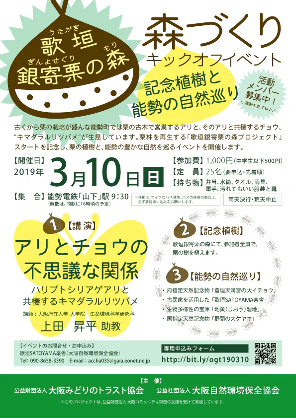 今回のプロジェクト地、「歌垣 銀寄栗りの森」では、来月、3月10日にイベントを企画しています。能勢や歌垣ってどんなところ?と思われた方、写真や言葉では説明しきれない能勢の里山の魅力を感じていただきたいと思っています。