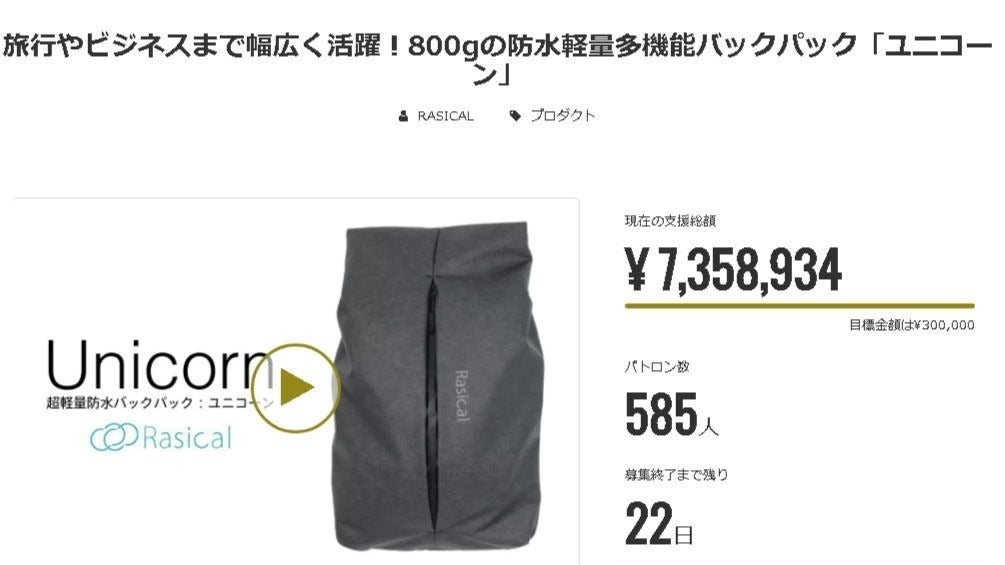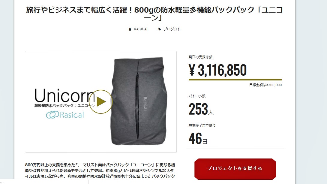 皆様、いつもご支援ありがとうございます。おかげさまで、「ユニコーン」のご支援総額が300万円を突破いたしました!ご支援者数も250名を突破しております。ありがとうございます。使いやすさ、快適さに加えデザイン性にもこだわった、バックパックである「ユニコーン」。こちらは、実際にお使いいただいた皆様からの貴重なご意見を取り入れ、バージョンアップを加えた新生ユニコーンとなっております。是非、お一人でも多くの方に使っていただきたいと考えております。今後ともよろしくお願いいたします。