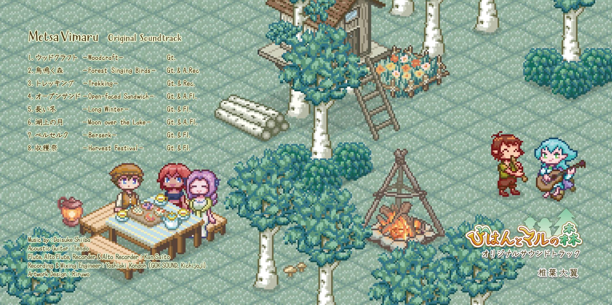 「びはんとマルの森」のディレクター兼デザイナーのりるをさん書き下ろしのピクセルアートによるジャケットです。一目でゲームと音楽の雰囲気が伝わる素敵なデザインとなりました。