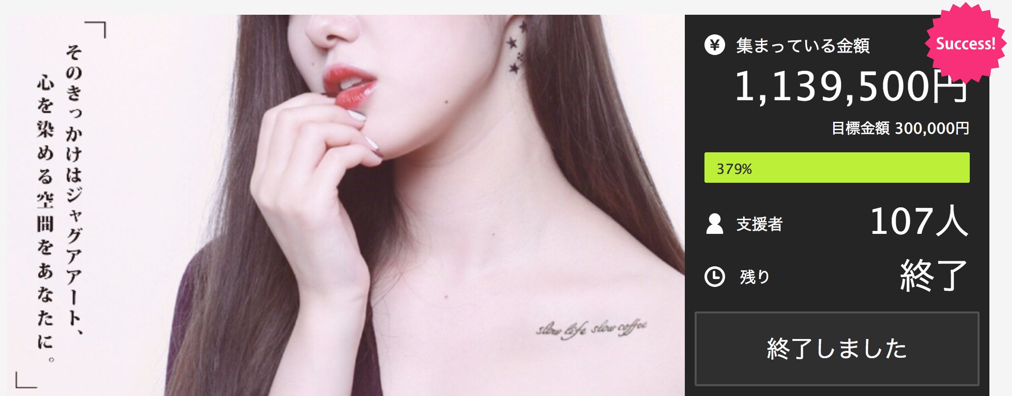 2019/03/19 15:31この度は、【肌に残らないタトゥー「lit」をジャパンカルチャーに。】ご支援いただきありがとうございました。終わった瞬間泣いた〜〜〜〜!!!笑ほんとね、もうありがとうしかないです。ファイナルゴールはまさか達成できるとは思っていなかったから自分でも驚いています・・・笑そしてタイミングよくいろんなお話をいただき怒涛の1ヵ月半でした。まず2月は株式会社MJE主催の25歳以下の若手起業家を対象としたピッチイベントにて「伊藤忠商事賞」「阪急阪神ホールディングス賞」をダブル受賞いたしました。人前に出るのが苦手だからこそ1年練習し続けて、ありのままの自分で発表できたこと、飾らない自分で評価いただけたことが嬉しくて嬉しくて(泣)やってきてよかったな〜って心から思いました。https://prtimes.jp/main/html/rd/p/000000003.000041155.htmlその後、プレスリリースのlit partyには160人の来場者が!!いっぱい反省点もあるけど、来てくれた人には楽しんでもらえてなにより。面白かったな〜〜〜スタッフとの関係も深まって、大事な人がより大事に思えた1日でした。実は、家族も来てくれたんよな〜w自分の成長を見てもらえるいい機会になった気がする!!(※一緒に面白いことできる人常に募集してます〜〜!)https://prtimes.jp/main/html/rd/p/000000004.000041155.htmlそして3月16日、読売新聞の夕刊にてジャグアアートが掲載されました。ほんと、すこーしずつだけど形になって来たイメージ。飽き性な私からしたらこんなこつこつできるのはジャグアアートだけやなって思います。これだけはまれるものがあるっていいことだよな〜〜〜でも新聞って若者離れしてるからそんなに大きな変化はなく・・・w雑誌とかの方が相性あうのかな〜って思った。雑誌進出したいな〜〜〜〜https://www.yomiuri.co.jp/local/kansai/news/20190316-OYO1T50030/ここ最近では・百貨店やTSUTAYAでのイベント・アパレルブランドとのコラボ・出版など面白いお話をたくさんいただいて、地道ですが肌に残らないタトゥー「lit」をジャパンカルチャーに。が近づいてきてるように思います。【ワークショップのご案内】4月6日13時〜15時 @大阪4月19日13時〜15時 @東京にてlit〜ジャグアキットの使い方講座〜するよ!!キット買った人は無料で参加できるしぜひきてください〜〜**今年はどんどん挑戦していきたいし、ジャンル関係なくコラボもしていきたい。もし、一緒にコラボしてくれる方がいればお声がけください!!N.designとしてできることとしては・イベント出展(ブースとかで施術します!)・グッズ制作(ロゴとかデータもらえたらジャグアのシールにできるよ!)・トークイベント、登壇(なんでも喋っちゃうよ!)です!!ということで、今後もぶっ飛ばしていくのでよろしくお願いします!!!リターンに関しては個別に連絡させていただきます〜〜〜!! もっと見るクラファン100万円達成いたしました!!