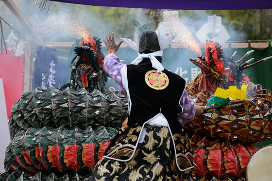 こういった神話劇のような演目のことを「神能(しんのう)」と呼び、打立(うったて)から猿田彦大神の舞までの神事舞と区別されています。