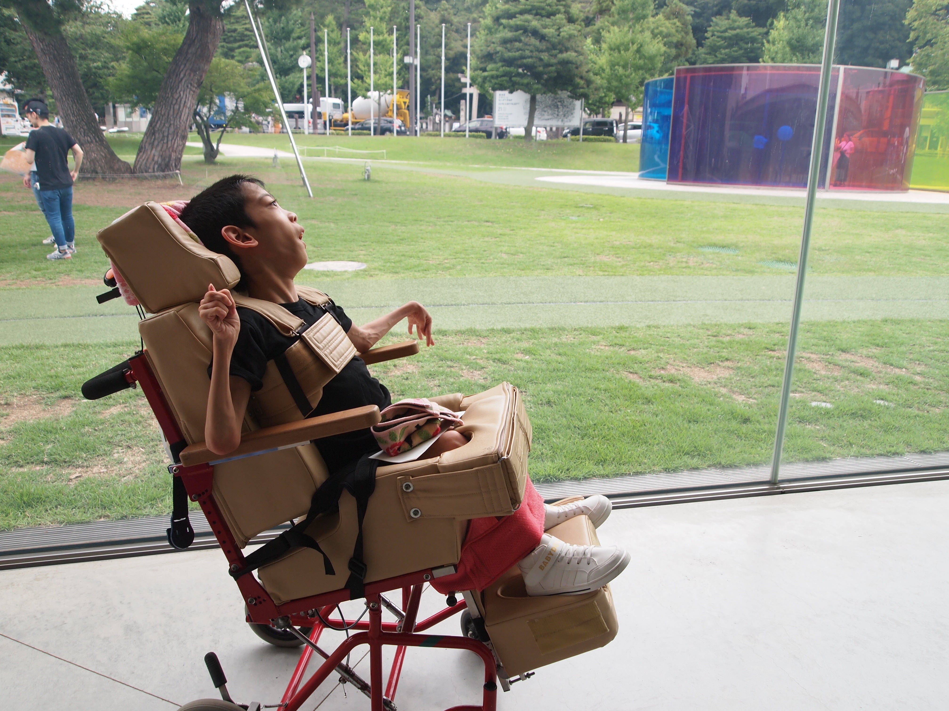 旅行に帯同している保育士やOT(作業療法士)やPT(理学療法士)の方々が、「姿勢を起こしたほうが花火がよく見えるかも」と工夫していくうちに、自分で座れるようになったのです。