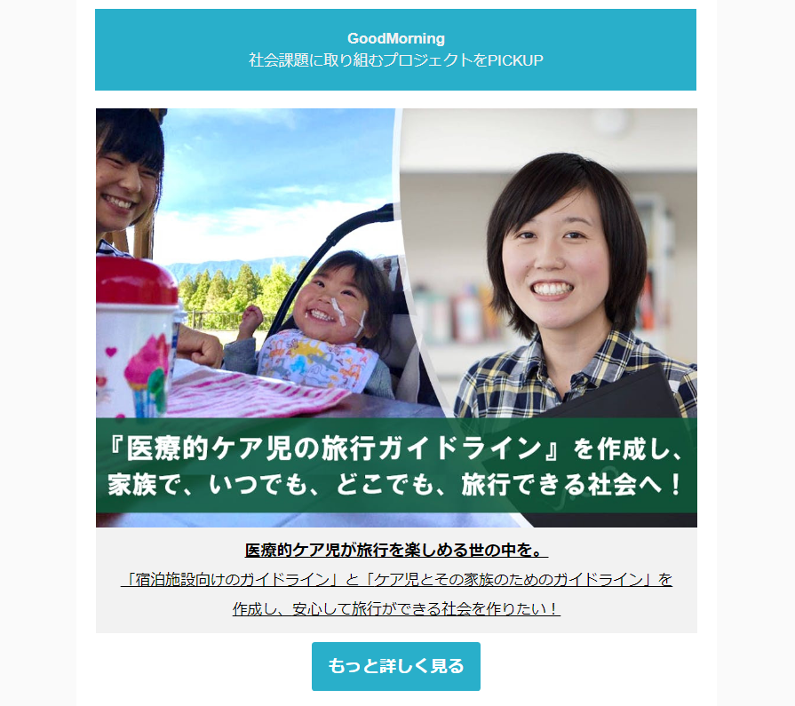 いよいよクラウドファンディングの募集期間も残すところ10日となりました。現時点で92人、912,000円、60%のご支援をいただいています。お一人お一人の応援メッセージを拝見し、この医療的ケア児のガイドラインへのニーズの高さ、そして、誰もがいつでもどこへでも旅行できる社会を作っていきたいという想いを一緒に願ってくださっていることがとても嬉しいです。今回のプロジェクトはall-in方式で行なっており、目標金額に達しなかった場合もプロジェクトは行います。しかし、150万円の目標金額に対して、先にお伝えしたとおり、まだ残り約60万円(40%)が不足しております。未達の場合にはモニター宿泊会の費用、医師・看護師等の滞在費用、ガイドラインの作成費は持ち出しとなります。反対に目標金額を越えることができれば、医療的ケア児の旅行を受け入れるにあたっては、モニター宿泊会に参加されるご家庭への交通費支援や、必要な備品・設備等への投資(段差解消のためのスロープの設置など)も可能となります。目標金額150万円の達成にむけて、皆様のご協力をお願いしたく、今回シェアまつりを企画いたしました!【シェアまつりって何?】皆さまがお使いのSNS(TwitterやFacebook)でクラウドファンディングのURLをシェアする、それだけです!!ただ1つ、お願いしたいのは日時の範囲の中で投稿をいただければと思います。<シェア祭り開催日時>3月8日(金)18:00~23:00<シェアしていただきたいURL>上記の日時の間に、下記URLをご自身のSNSでシェアしてください!https://camp-fire.jp/projects/view/121360パトロンの方には、ぜひ支援した理由や、応援コメントなども添えていただけると嬉しいです…!皆様のご協力をどうぞよろしくお願いいたします!!!
