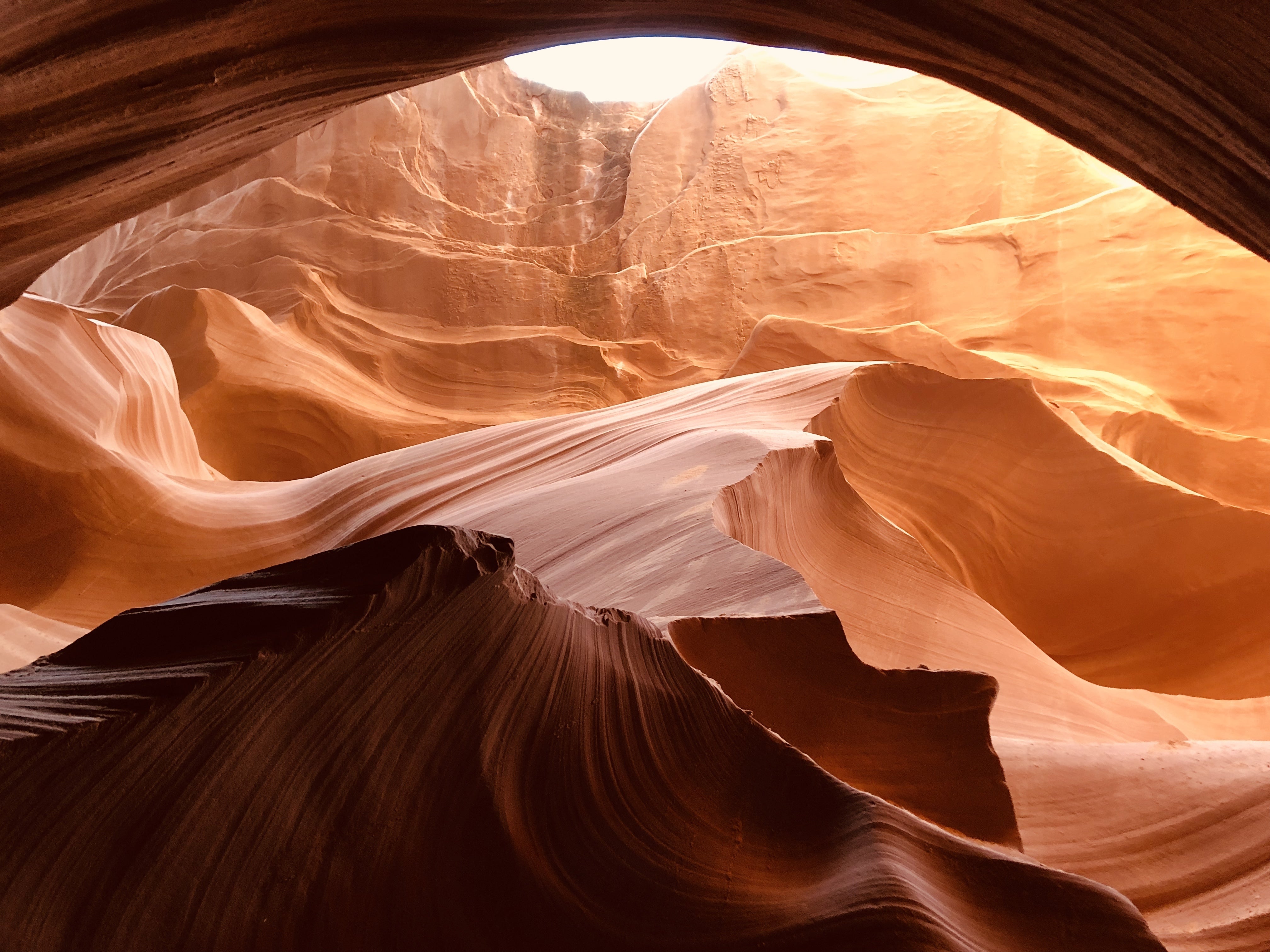 例えば、アンテロープキャニオン。ここでは、自然の創り出した波打つ岩壁と頭上から