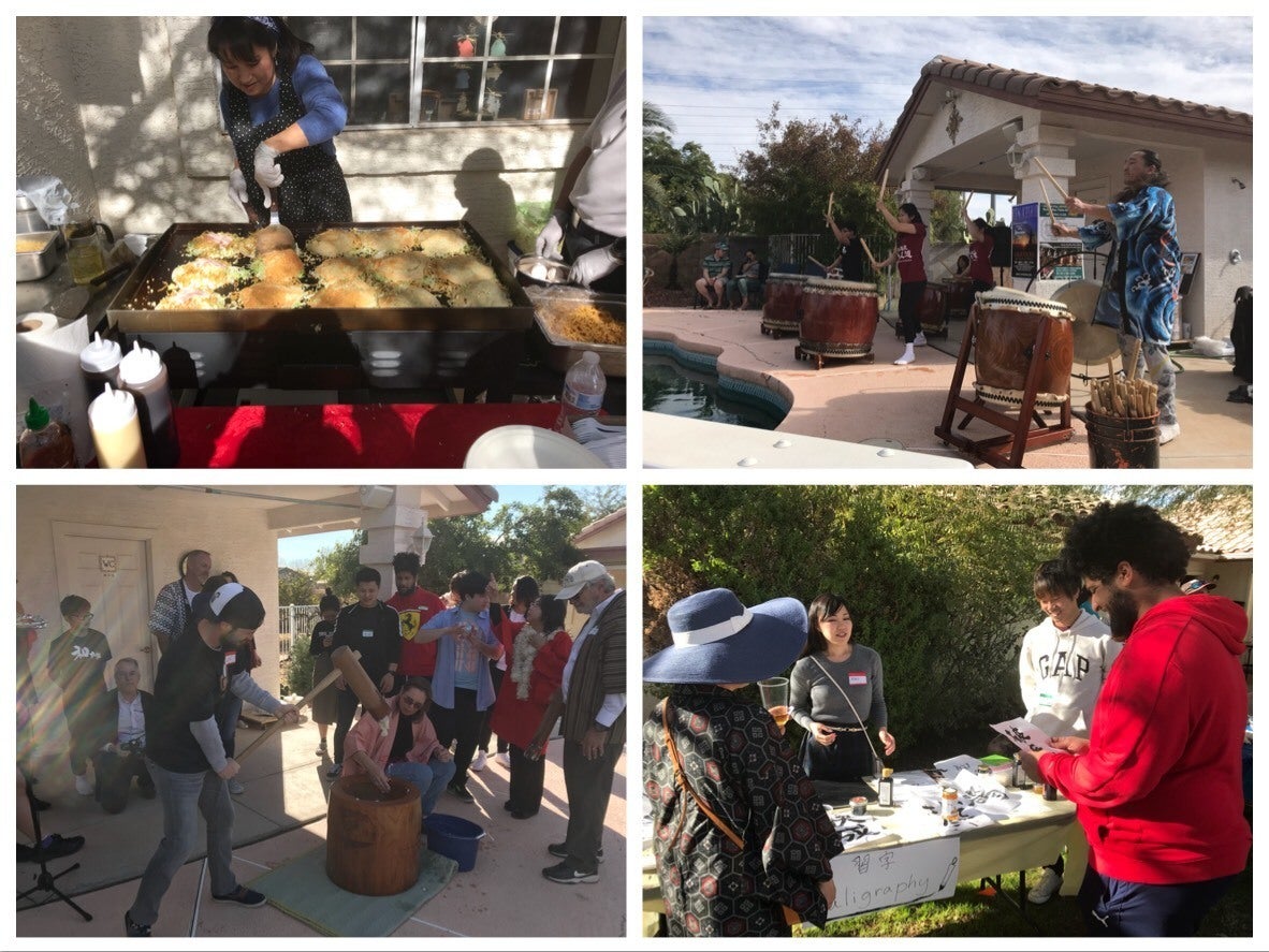 また、アリゾナ在住の日本人を中心としたミートアップグループに参加し、2019年1月12日に僕たちが企画した新年会を開催しました。新年会では広島風お好み焼きや焼き鳥を提供すると共に書き初めや昔ながらの日本の遊びを体験できるブースを設置したり、和太鼓パフォーマーを招待したりして、現地に在住のアメリカ人を含む100人以上を動員しました。