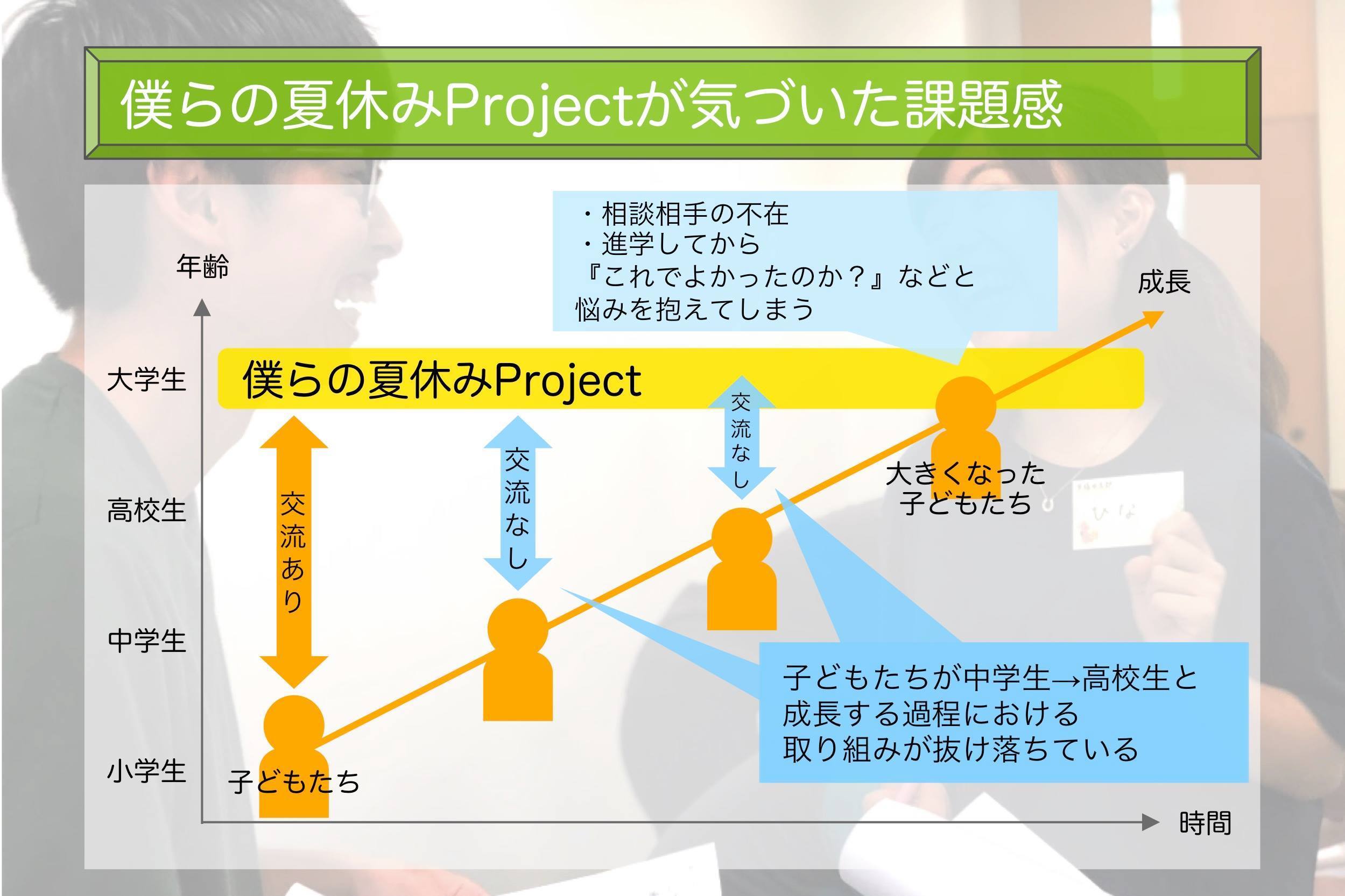 そこで、子どもたちとの出会いの場である「僕らの夏休みProject」という取り組みは続けながらも、中学生、高校生と成長していく子どもたちに対して、それぞれのニーズに合わせた取り組みを行うことが必要だと感じ、爽志たちと共にこのイベントを企画しました。