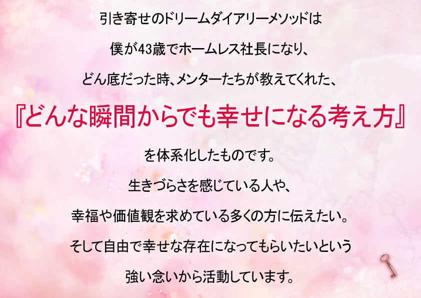 引き寄せのドリームダイアリーメソッドは、僕が43歳でホームレス社長になり、どん底だった時に、世界のトップコーチや社会的に成功者と言われる方が教えてくれたゴールデンルールで、『どんな瞬間からでも幸せになる法則』を心理学・脳科学・量子物理学から読み解き体系化したものです。