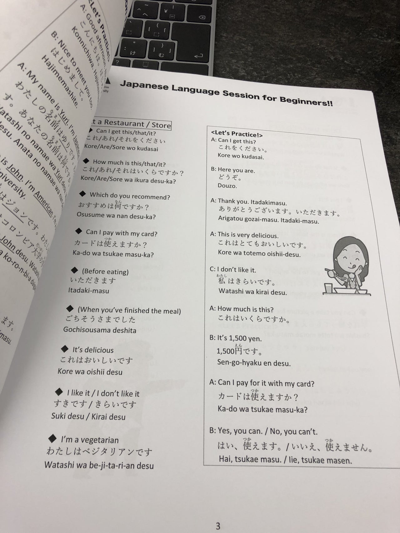 (レストランでのやり取りや道の聞き方など旅行会話も盛り込んだ資料)