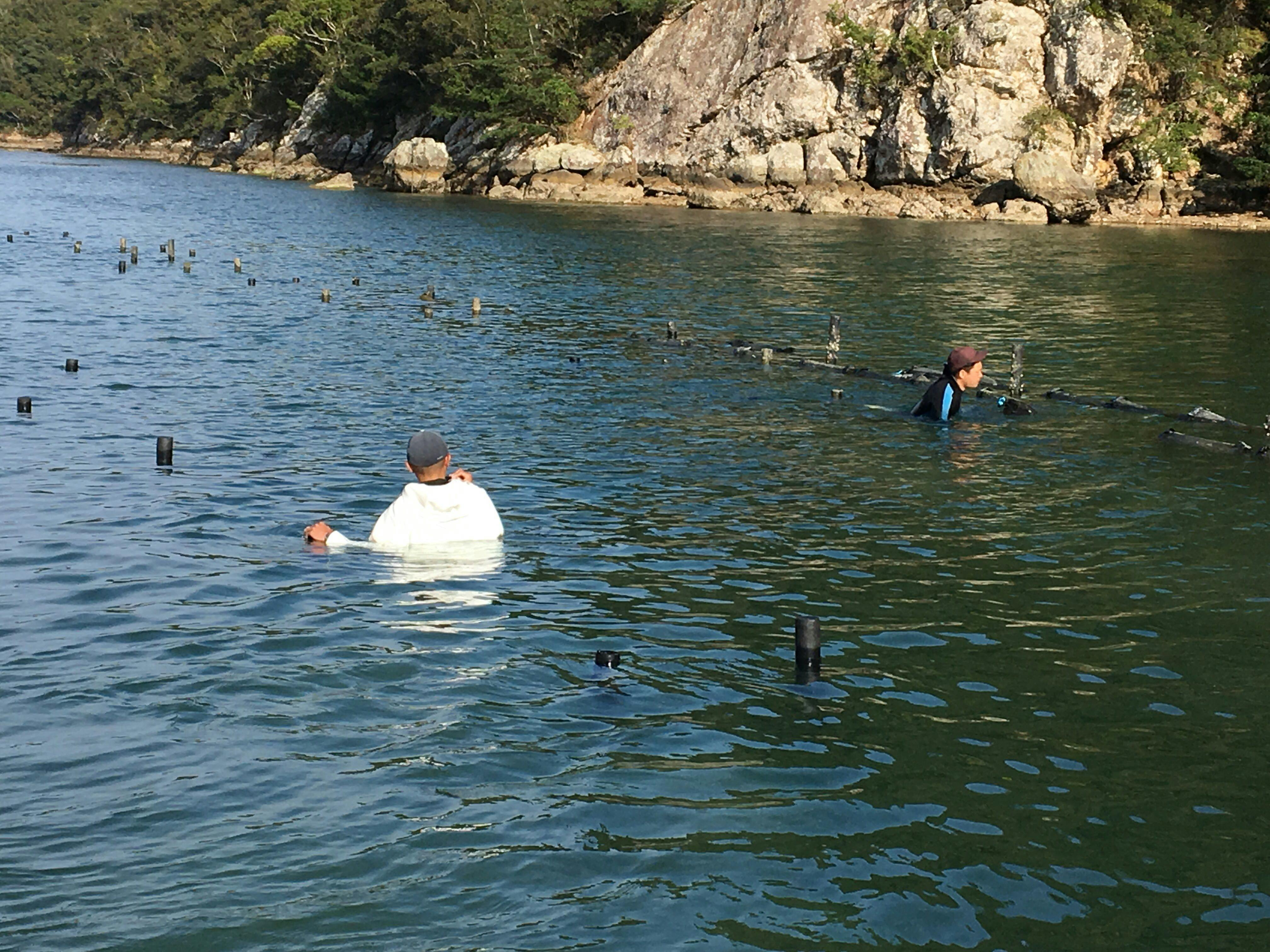 ↓持ってる杭(ポスト)を支柱として海に差し込みラインの基礎を作っていきます。うしろにあるポストはほんの4ライン程度のものなので必要本数はこの10倍以上になります!