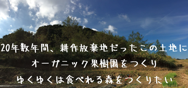 今回のプロジェクトを行う畑も20数年放棄されていた農地です。そこを開墾してオーガニック果樹園を作り、まるごと食べれる森が出来たら、そこへ沢山の人が集まったりして、新たな耕作放棄地の再生モデルができるのではないか?と考えたわけです。
