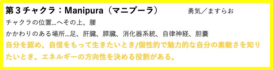第3Chakraの香り:レモン(フレッシュで少し苦味のあるシトラス調の香り)酸味のあるさわやかな香り。気分を元気付け、集中力を高めたい時、気分をリフレッシュしたい時に。