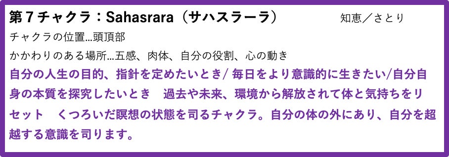 体表に8万8千あるとも言われるチャクラの中でも、頭頂部から脊柱に沿って並んでいる7つのチャクラが私たちの心とカラダをつなぐ主要なチャクラです。これらのチャクラが正常に開き、エネルギーが均等に全身を循環することで心身のバランスをケア、潜在能力が開花されやすくなるとも言われています。