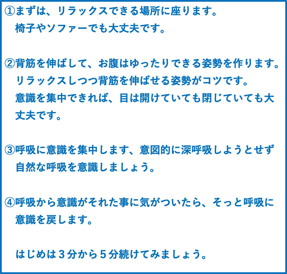 マインドフルネスの方法の一つにマインドフルネス瞑想があり、アメリカで1970年代にジョン・カバット・ジン教授によって作られました。古くからの瞑想の精神性や宗教的な要素を取り除き、姿勢を正して、ただ自分のしている呼吸やカラダの感覚に意識を向けるだけの現代に適合させた瞑想方法です。
