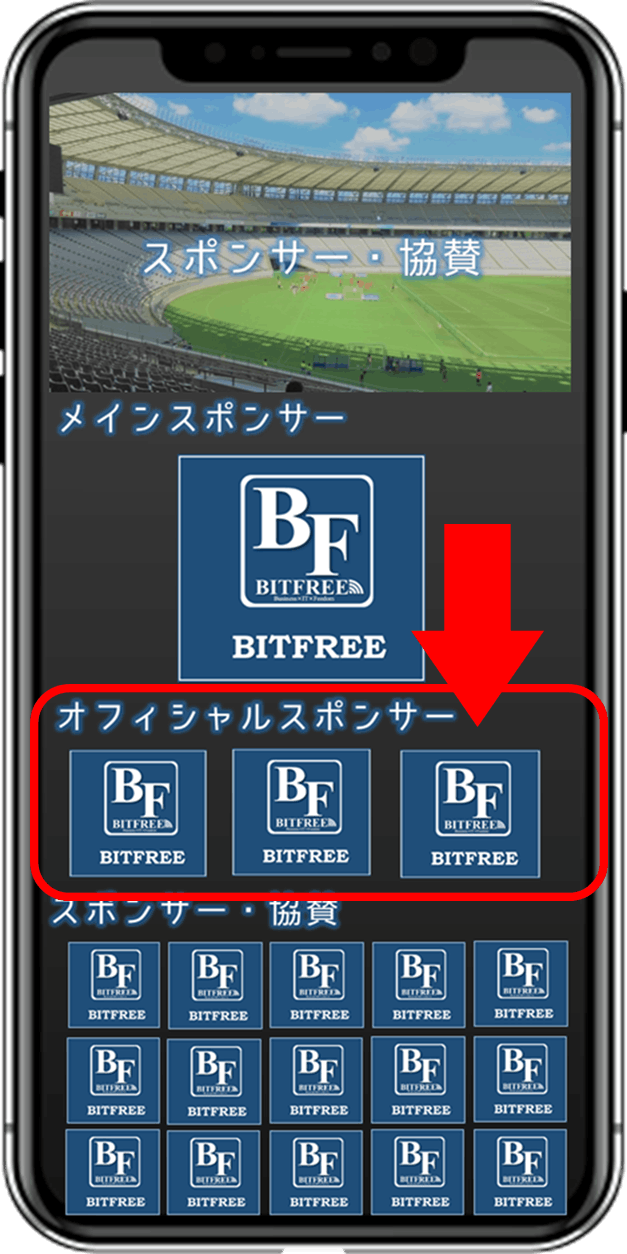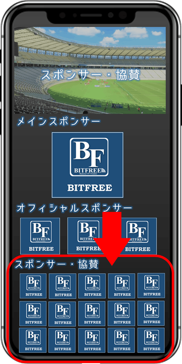 ⑥アプリ内スポンサー画面にて掲載(大きめの枠)になります。