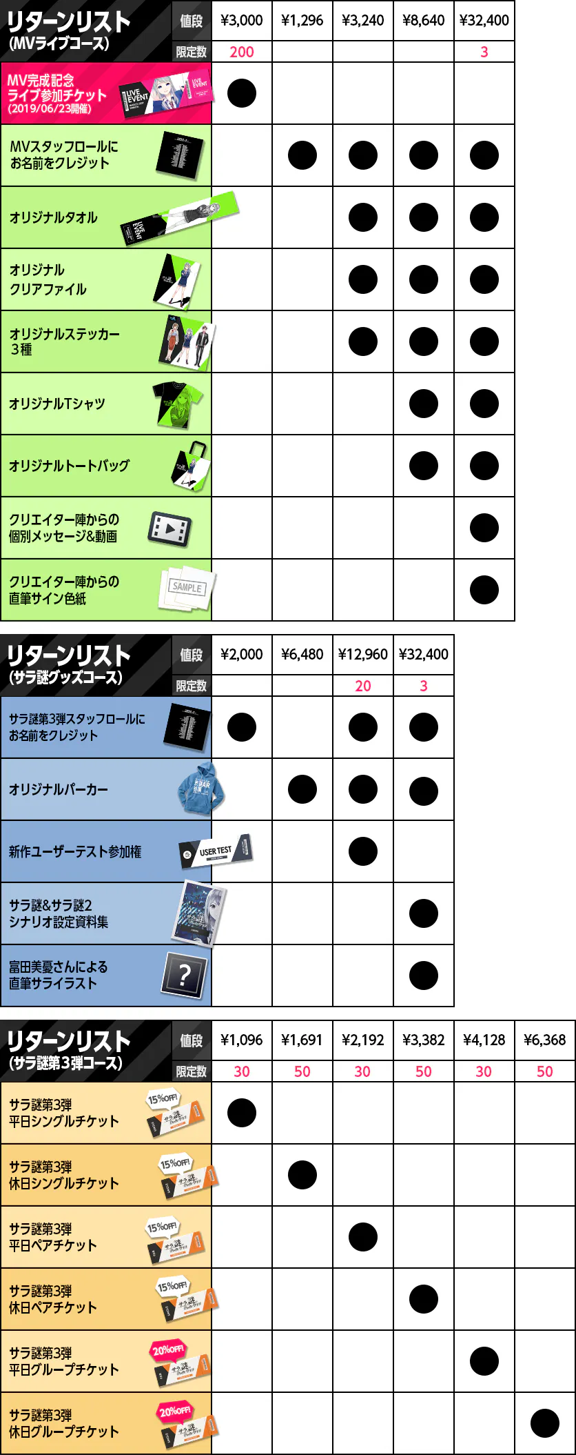 あと、今回なんと特別に!私たちが渋谷でやっている『AR謎解きゲーム(通称 #サラ謎)』の割引券もリターンに入れたよ。 数はとっても少ないから、早い物勝ちね! それじゃあ、みんなの応援待ってるよ。 あなたと一緒につくるステージ、今からとーってもわくわくするよ!