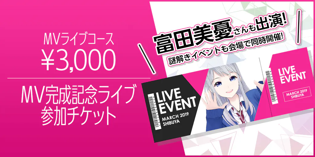 それだけじゃなくて、6月のMV完成記念ライブで私と会いたい♪って人は、【MV完成記念ライブ参加チケット】へ!(富田美憂さんも来てくれるよ!)