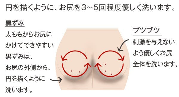 A:ごしごし洗うとお尻が赤みを帯びる等、逆効果になる場合がございますので、ごしごし洗いはお控えください。毎日ごしごし洗うと効果がでるわけではありませんので、週2〜3回を目安に優しく洗ってください。