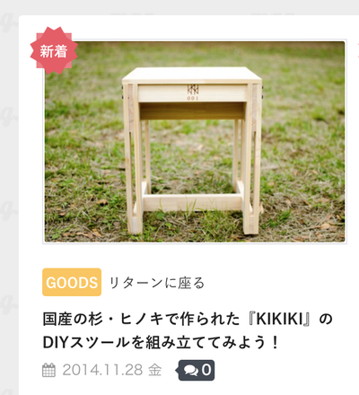 2014/11/28 13:27「リターンに座る」という記事。 実際に組み立てて座る所まで、分かりやすくご紹介して頂いております。 (組み立ての様子のGIFつき!) 公園で組み立てて頂いているのですが、緑の中でヒノキの明るい色が映えますね。 その他、先日KIKIKIが参加した”「木で、未来をつくろう2014」シンポジウム”の取材と、 12/6(土),7(日)に開催するワークショップの案内も記事にして頂いております。 ワークショップもまだ受付中ですので、この機会に是非ご検討ください! http://mag.camp-fire.jp/2654/ もっと見る