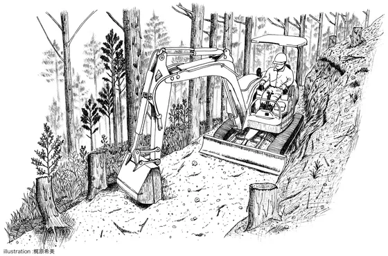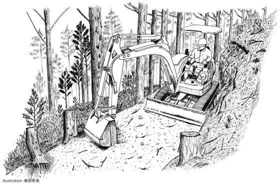 急峻で雨の多い日本の山の作業道は崩れないことが前提ですが、コンクリートや砂利などで固めるのではなく、
