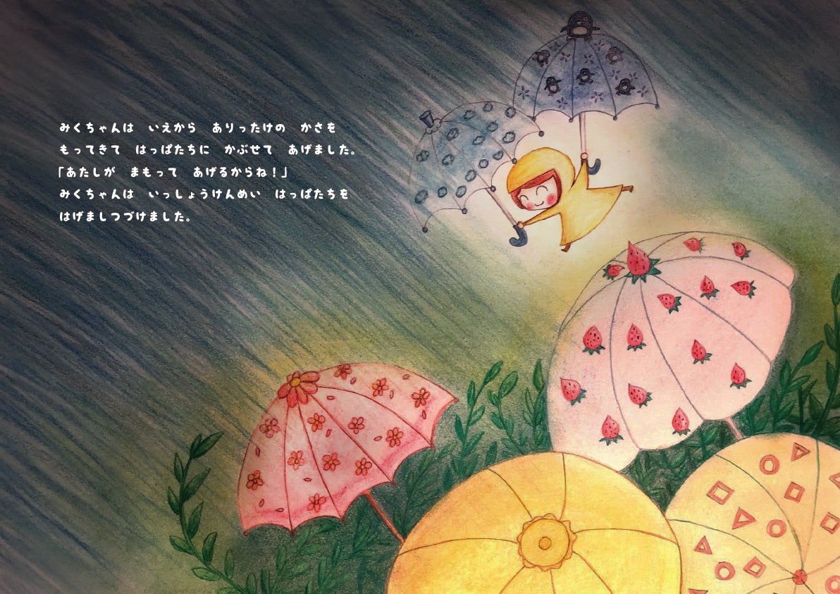 みくちゃんは いえから ありったけの かさを もってきて はっぱたちに かぶせてあげました。 「あたしが まもって あげるからね!」みくちゃんは いっしょうけんめい はっぱたちを はげましつづけました。
