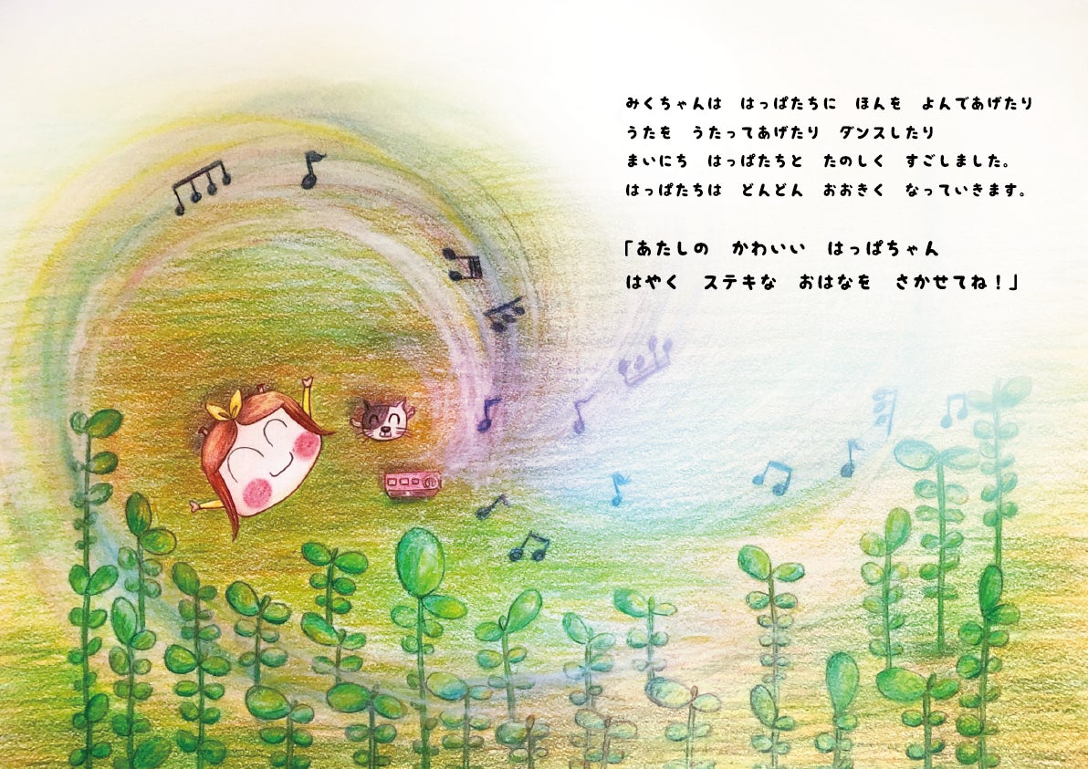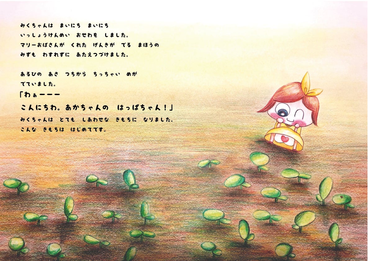 あるひの あさ つちから めが でていました。「わぁーーーー こんにちわ。あかちゃんの はっぱちゃん!」みくちゃんは とても しあわせな きもちに なりました。こんな きもちは はじめてです。