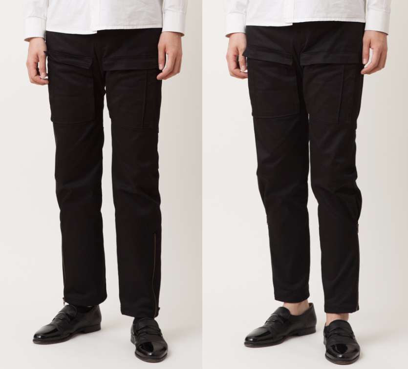 2. サイドジッパーで簡単に裾の太さを変えることが出来るので、気分やシーンに合わせてストレートにもテーパードにもなる1枚2役の優れモノ