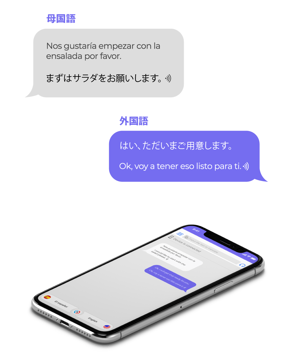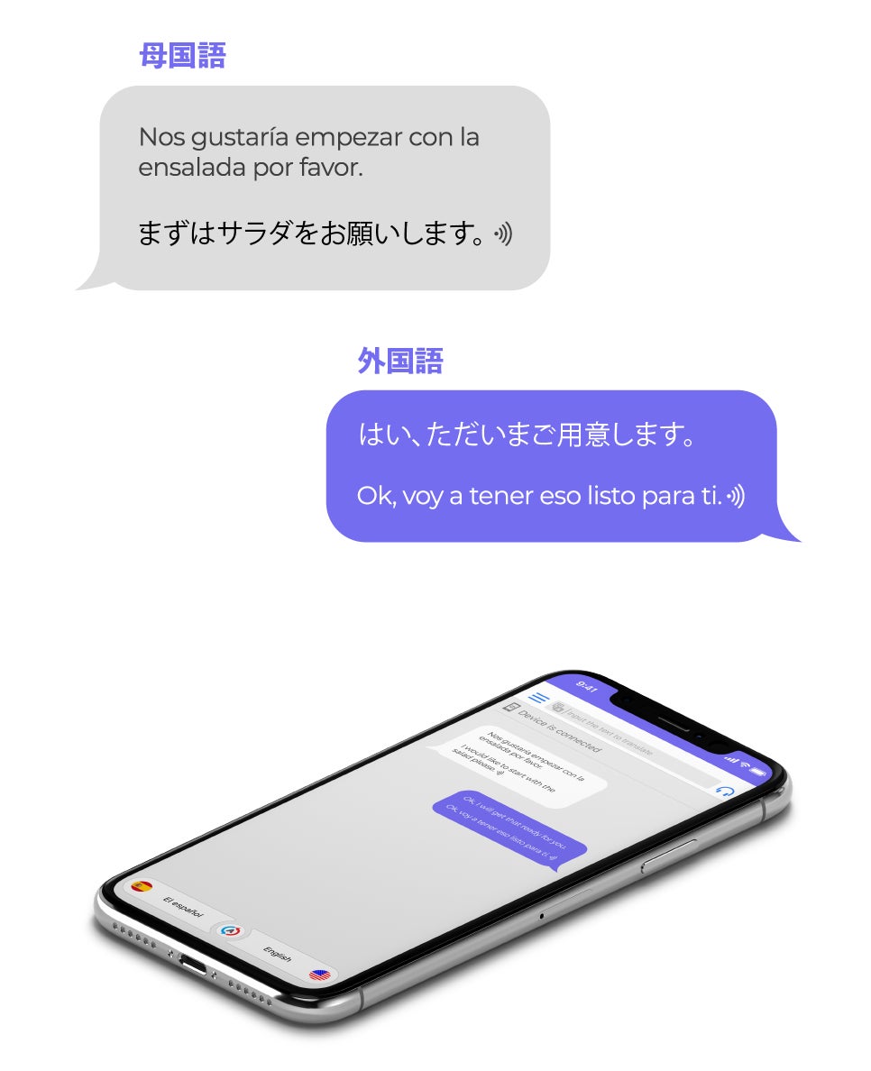 Bさんが話すとき、Aさんがモバイルアプリの「外国語」ボタンをタップすると、Bさんの会話が翻訳され、Aさんのイヤホンで話します。 Bさんは翻訳を聞きません。