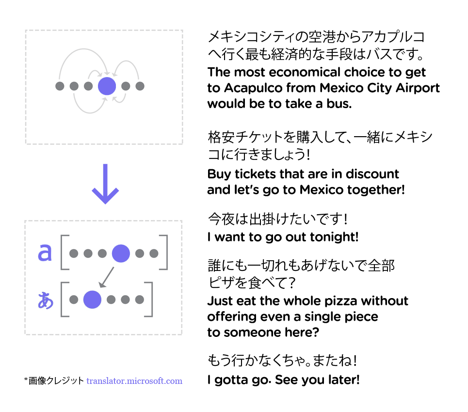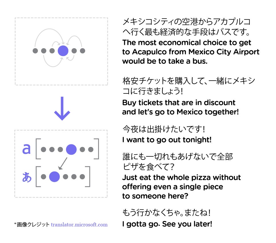 Microsoft翻訳はニューラルマシントランスレーション(NMT)システムに基づいています。 NMTは、当時の業界標準のスタティスティカルマシーントランスレーション(SMT)技術に比べて翻訳品質に大きな進歩をもたらしました。NMTは、翻訳をする前に文章の文脈を的確にとらえるので、より高品質で、より人間的に聞こえる、流暢な翻訳を提供します。 もっと詳しく知る。* 画像クレジットtranslator.microsoft.com
