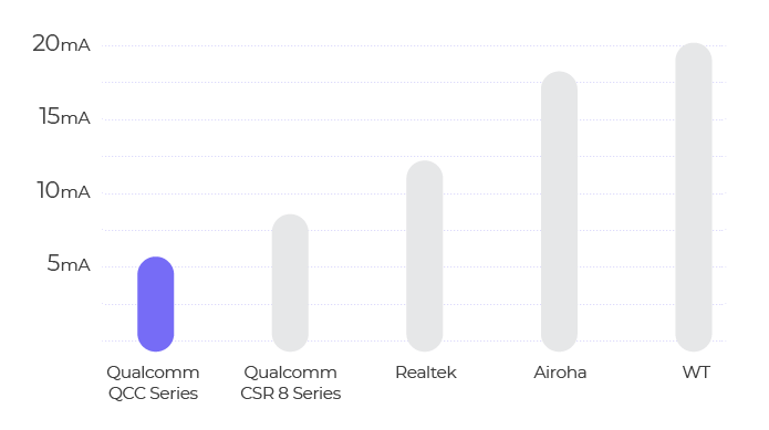 現在、流通しているほとんどのBluetooth 4.0チップセットの消費電力は約20mA(ミリアンペア)以上です。 また、一部のBluetooth 5.0チップセットは、電力消費を10mA以上に制御できています。 しかし、QCCシリーズは消費電力が6mA以下で競合他社の約半分となっていて、これは間違いなくBluetooth市場では最高の数値です。 * mAは、電気伝導体を流れる電流と、電子の流速の尺度の単位です。