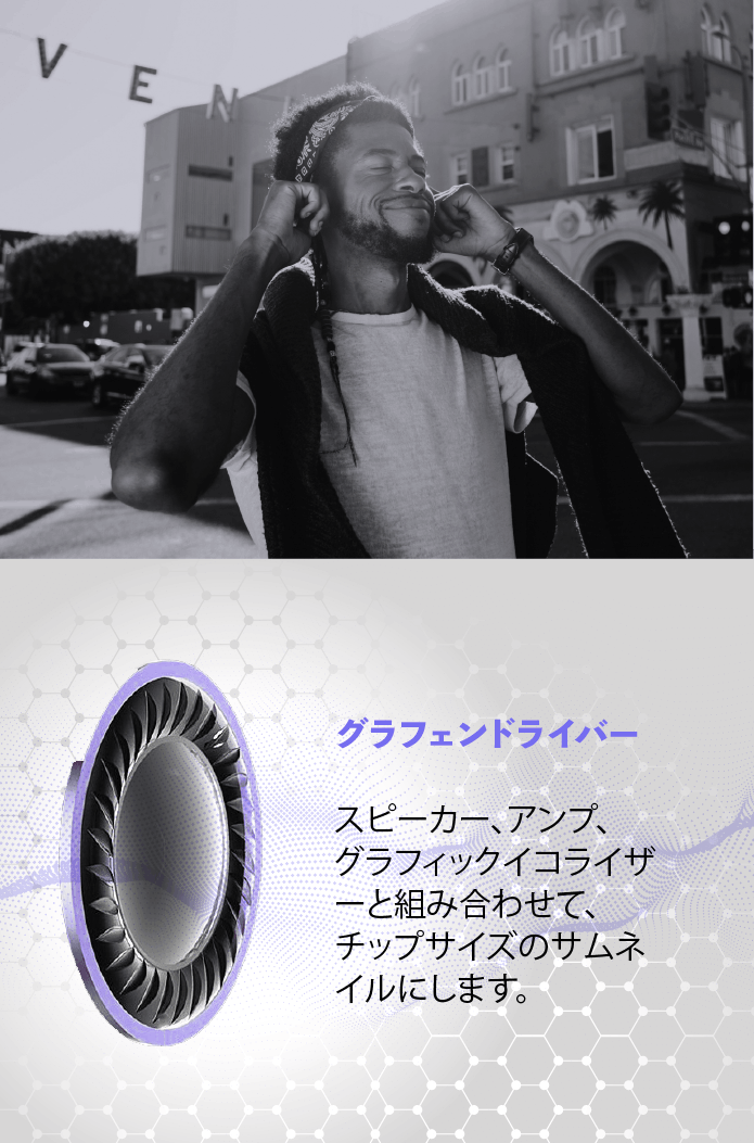 FITO Tap Proのダイナミックドライバーはグラフェンコーティングが施されていて、これにより振動の正確さを保証し、特に中音域と高音域の周波数範囲にわたって音の明瞭さを高めます。*グラフェンの構造 ー 六角形の格子内にある単層の炭素原子。