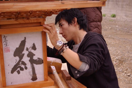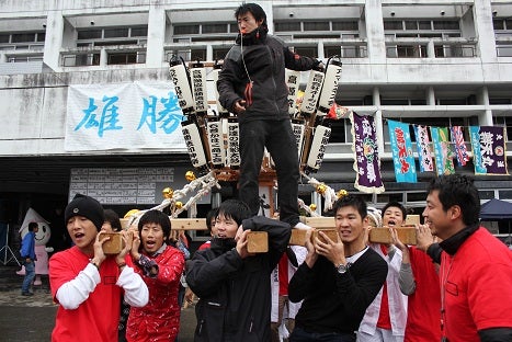 雄勝町仮設商店街のオープンを記念する復興市が開催されました。この仮設商店街は震災後初めての商店街で復興のスタートとも言えるものです。海産物、硯、漁網ミサンガなど多くのお店が出店し、雄勝らしい活気が感じられました。 藤原君が4カ月かけて作り上げたお神輿をお披露目。藤原君直筆の“絆”の文字も。協賛いただいた方々の名前が入った提灯を一つずつ、つけていきます。