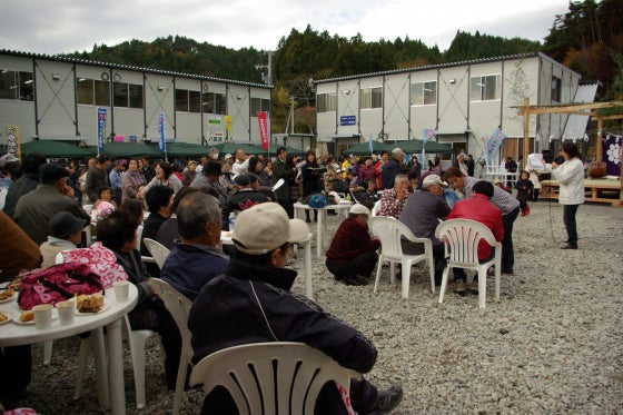一日目とは打って変わって快晴の二日目。こんなに多くの方々が復興市にいらっしゃいました。前日同様和太鼓演武やバンド演奏で盛り上がりました。