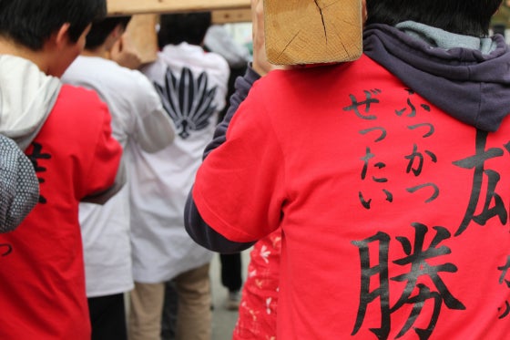 ”雄がつふっかつ絶対勝つ”おそろいのTシャツを着て、雄勝の復興を願って最後のお神輿を担ぎます。